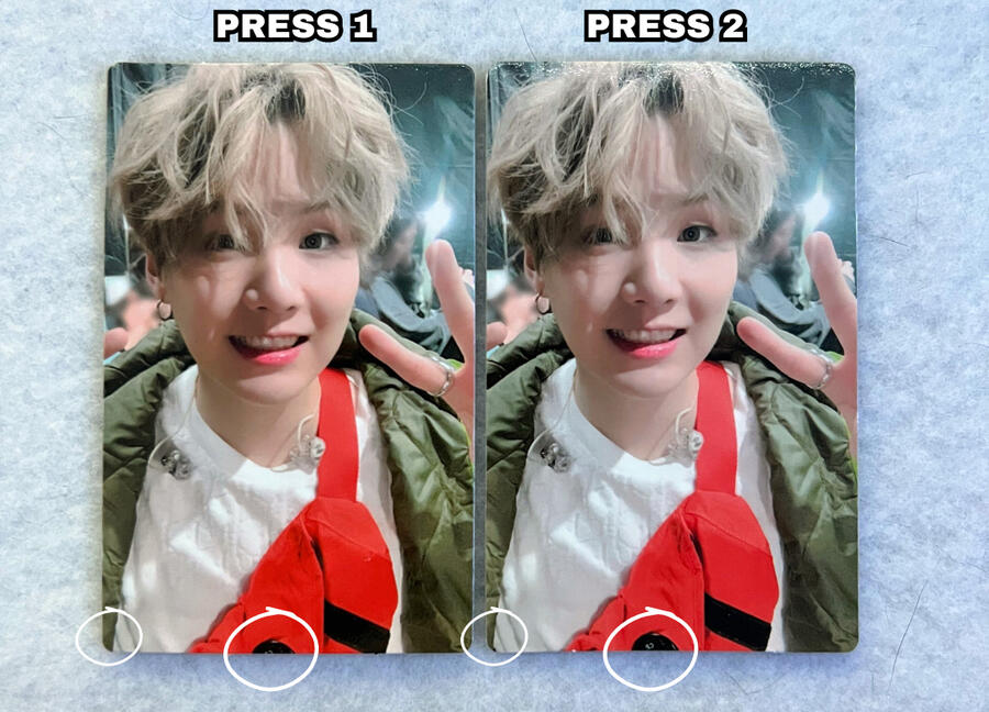 Press 1 photocards have slightly rounder corners, whereas the corners on press 2 appear to be slightly sharper/tighter. It is a very minor observation, please refer to the images below.