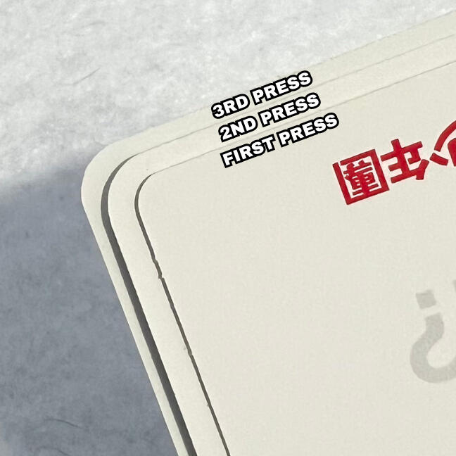 Press 2 lucky draws have inconsistent corners. They often aren't cut perfectly making them look lower quality. While generally the corners are more round compared to press 1, due to the inconsistencies, sometimes one corner can be rounder, while another can be sharper/tighter on the same card.