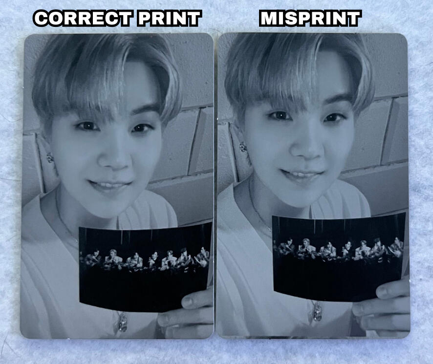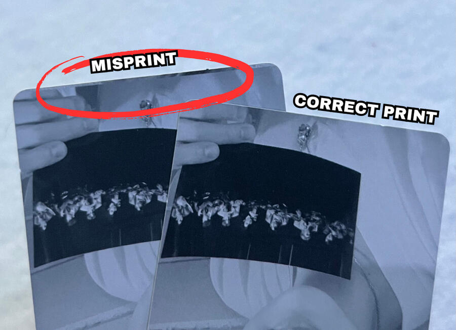 A misprint can be defined as any manufactured photocard that was not produced as intended, resulting in visual errors that differ from properly printed pcs. This can include shape, size, photo quality, color, fonts, texture, etc.